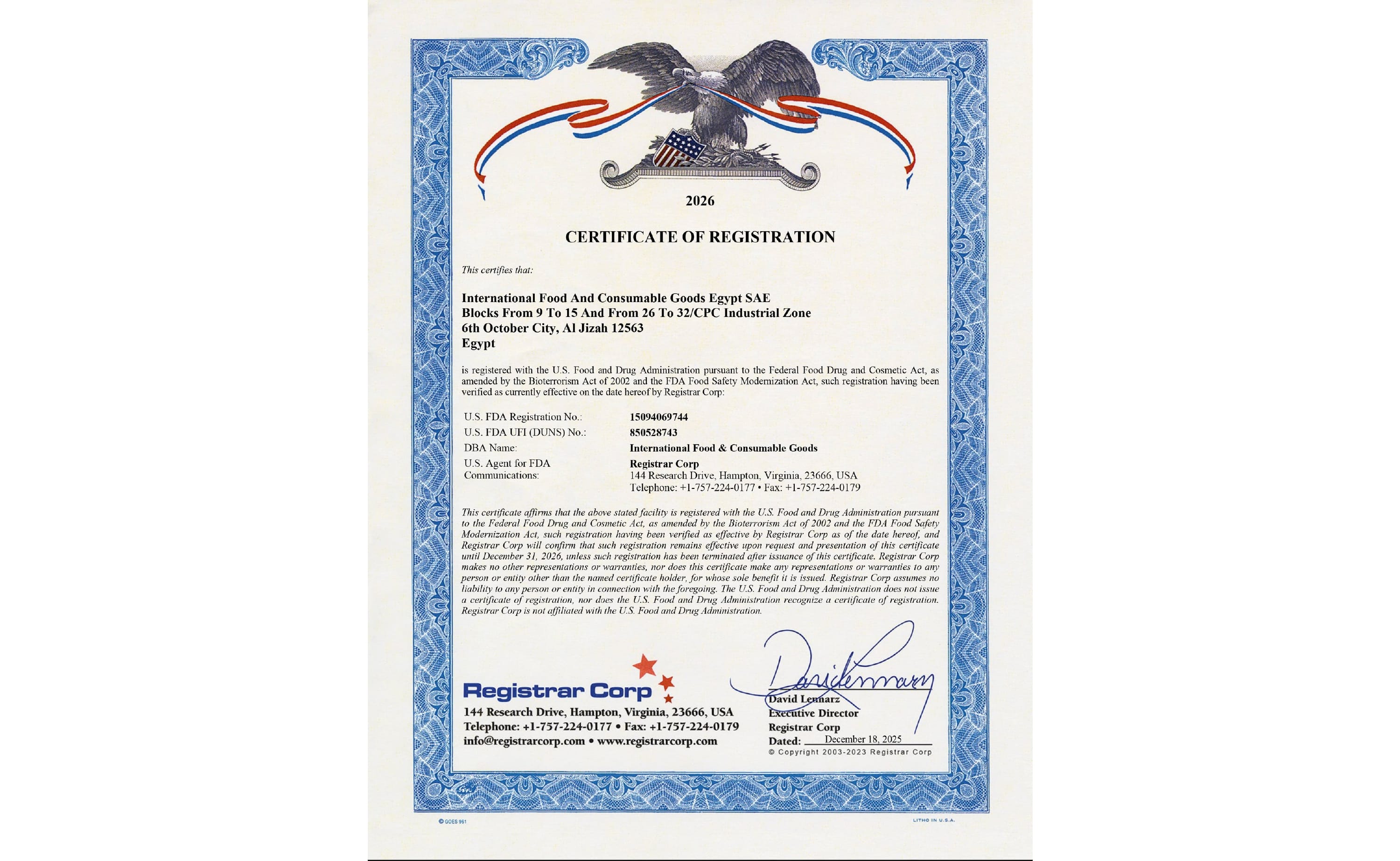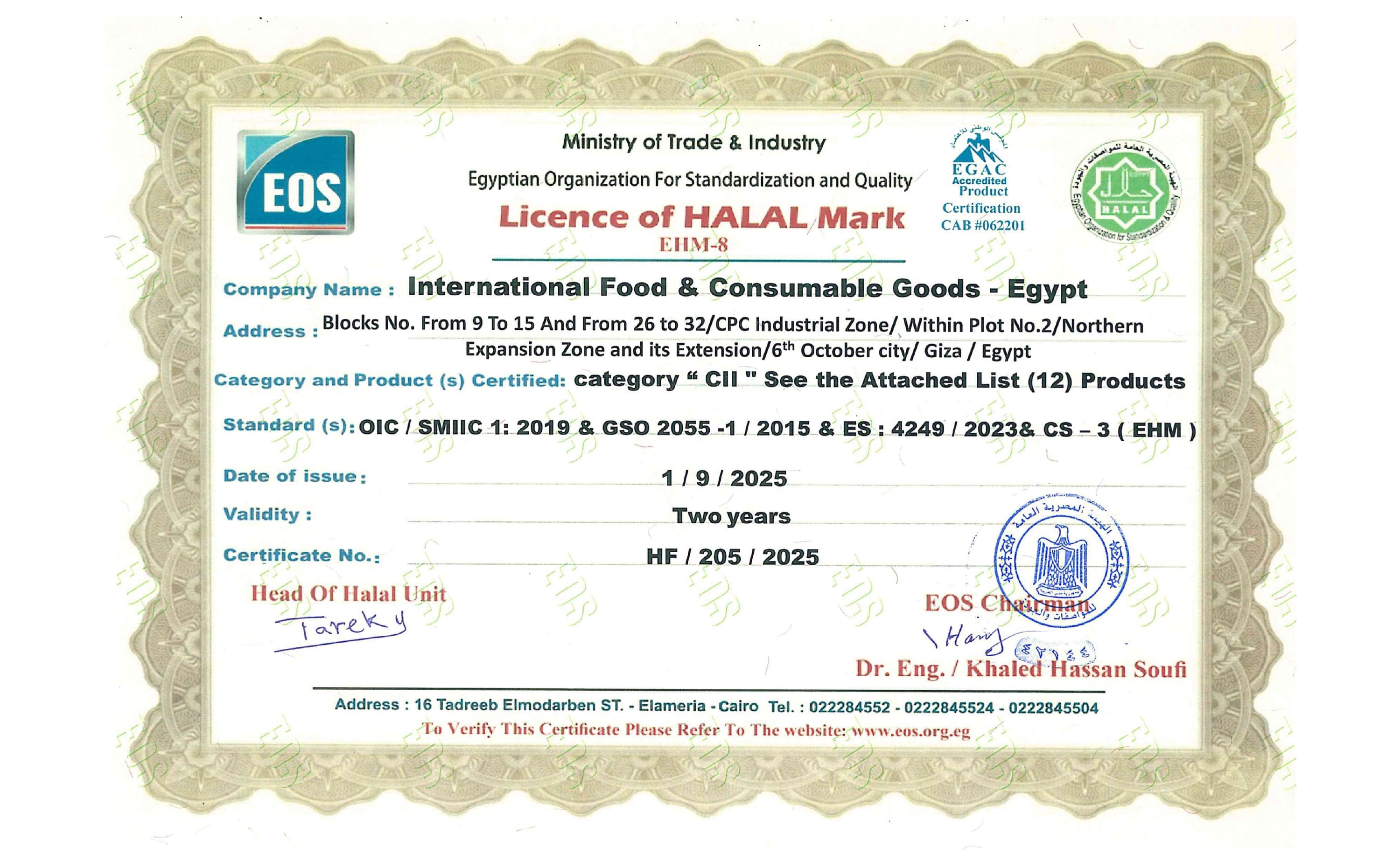 The company is approved by the National Food Safety Authority (NFSA) and operates in line with applicable regulatory requirements. IFCG maintains ISO 22000:2018, BRCGS Global Food Safety, Halal, Kosher, and ISO 45001:2018 certifications, supporting standardized food safety, quality, and occupational health and safety practices across its operations.